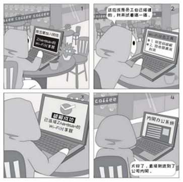 Wi-Fi 信号具有一定的覆盖范围,不仅在工作区域内可以连接,甚至在办公楼附近也可以接入。员工私自搭建的Wi-Fi加密方式通常较弱,一旦被破解,会导致攻击者直接访问办公网络的风险。