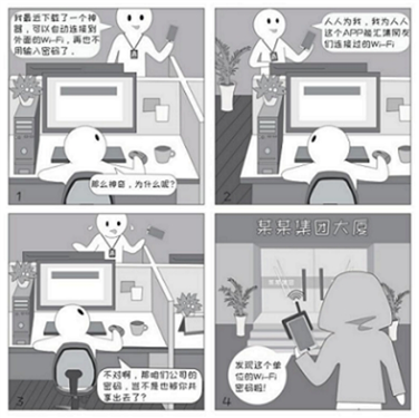 在办公区域,使用单位提供的网络接入方式,不要自行搭建个人热点,不要使用“Wi-Fi分享器”等设备;如确有需要,在架设无线路由器前必须经过单位批准,并进行安全检查,Wi-Fi 应使用安全算法、设置复杂密码、保证密码定期更改。