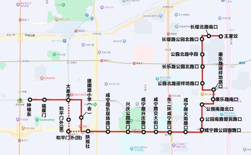 线路设置站点24个:王家坟、长缨北路南口、长缨路公园北路口、公园北路中段、长乐路公园北路口、公园北路迎祥坊路口、康乐路迎祥坊路口、康乐路南口、公园南路北口、公园南路爱民路口、咸宁路公园南路口、咸宁路火炬路口、东二环咸宁路口、咸宁路交大街口、咸宁路兴庆路口、兴庆公园南门、咸宁路乐居场路口、陕报社、建国路小学(去)、和平门外(回)、和平门里(回)、大差市、端履门、钟楼东。