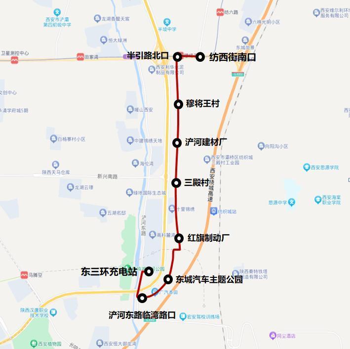 线路设置站点9个:东三环充电站、浐河东路临湾路口、东城汽车主题公园、红旗制动厂、三殿村、浐河建材厂、穆将王村、半引路北口、纺西街南口 。