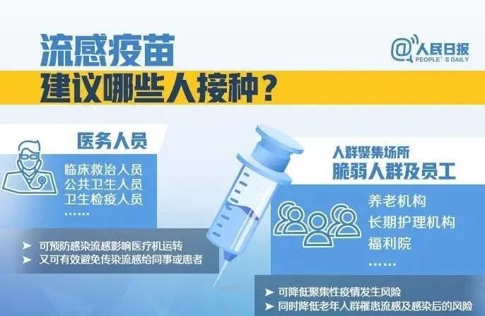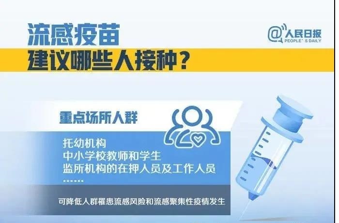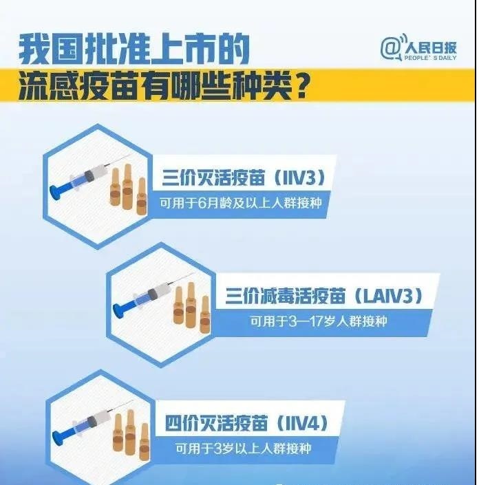 我区今年供应的流感疫苗有:三价流感疫苗、四价流感病毒裂解疫苗、鼻喷流感减毒活疫苗。老人、儿童及慢性病患者可在接种流感疫苗的同时或之后接种肺炎疫苗。