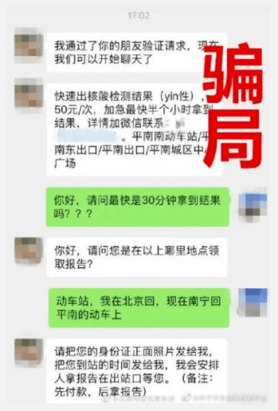 【真相】经警方核查,此为新型骗局。警方提醒,核酸结果一定要由经卫健部门认证的具备资质的医院、专业医疗机构或第三方检测机构出具。请网民注意不要轻信网络不实信息和所谓“私人渠道”,这不仅可能影响自身正常出行,更有可能落入不法分子非法敛财的骗局。