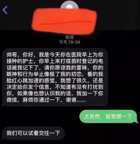近日,很多网民反映,收到自称是疫苗接种护士的短信,“帅哥,你好,我是今天你在医院早上为你接种疫苗的护士……你的眼神和行为举止像极了我的初恋……我们可以试着交往一下。”