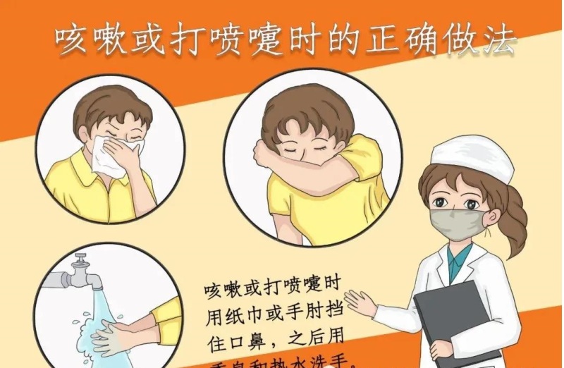 咳嗽打喷嚏时,用纸巾捂住口鼻,无纸巾时用手肘代替,注意纸巾不要乱丢。