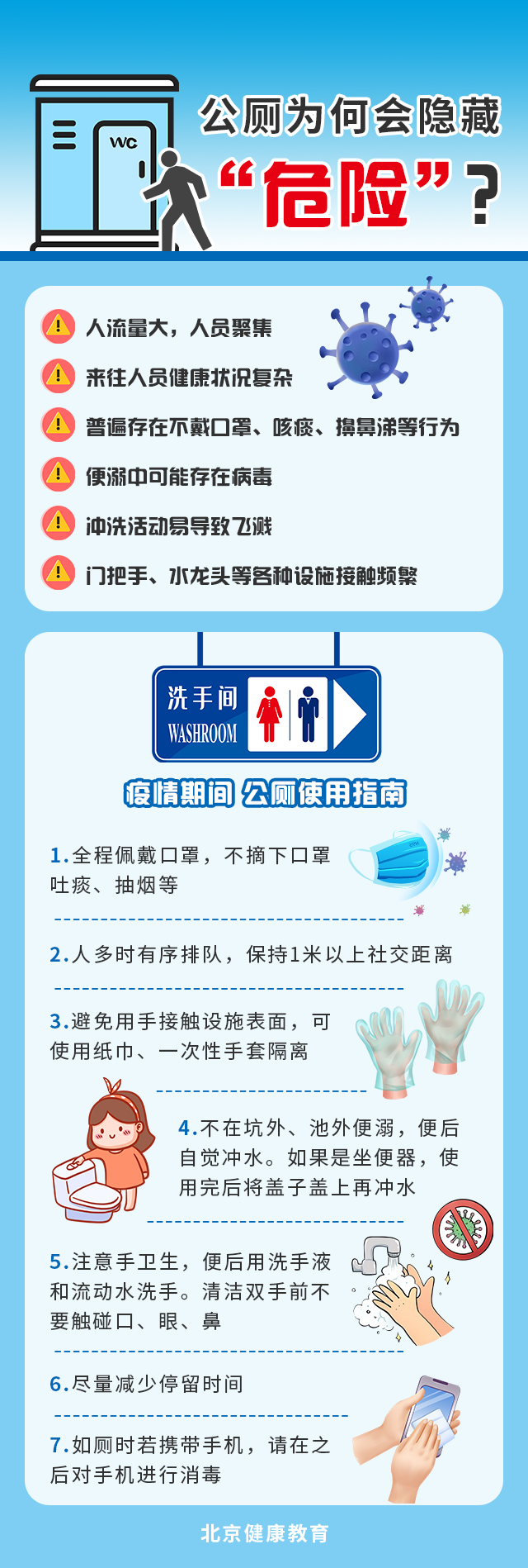 5月3日,在北京市新型冠状病毒肺炎疫情防控工作第323场新闻发布会上,市疾控中心副主任、全国新型冠状病毒肺炎专家组成员庞星火介绍,疫情分析中发现1例感染者因3次上公厕引发3例续发病例,继而引发了近40例感染者。在此提醒市民朋友们上公厕时坚持科学佩戴口罩,注意手卫生。