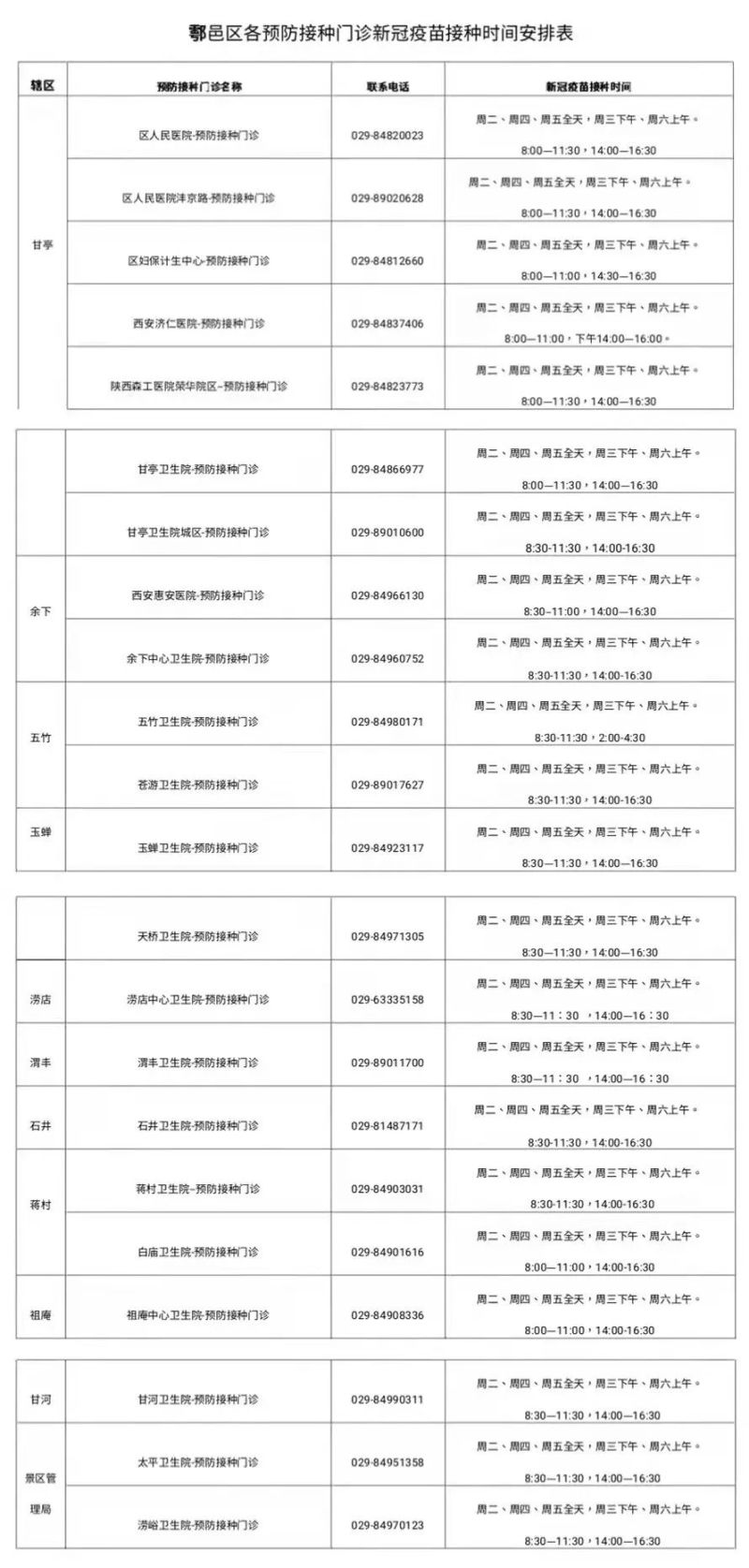 四、鄠邑区各预防接种门诊新冠疫苗接种时间安排(见附表)