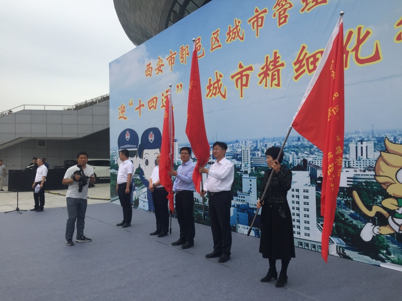区委书记范九利、区委常委宣传部长王值、副区长姚勇同志为城管局“服务十四运,奉献我的城”先锋队授旗。
