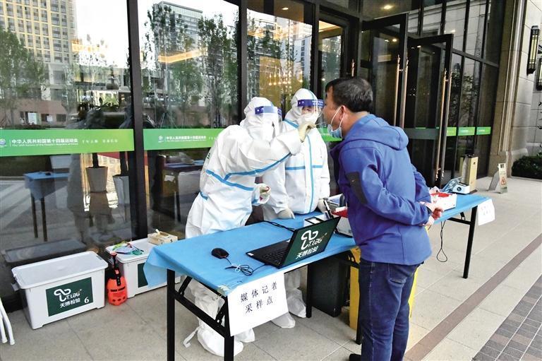 10月16日,全国第十一届残运会技术官员和媒体记者接待基地的防疫人员正在为媒体记者做核酸采样。本报记者 杜玮摄