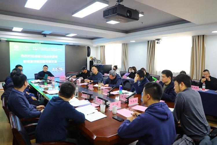12月9日,成都大运会执委会一行来到十四运会组委会新闻宣传部学习、交流大型体育赛会新闻宣传经验。十四运会新闻宣传部综合协调处、新闻宣传处、社会宣传处、媒体运行处等处室负责人分享了经验。随后,成都大运会执委会新闻宣传部综合处、新闻协调处、网络媒体处、主媒体中心处等处室以及成都传媒集团、成都国际传媒有限公司、成都新闻国际旅行社、成都市广播电视台大运频道等单位的负责人,分别就所关心问题与十四运会组委会新闻宣传部进行深入交流。