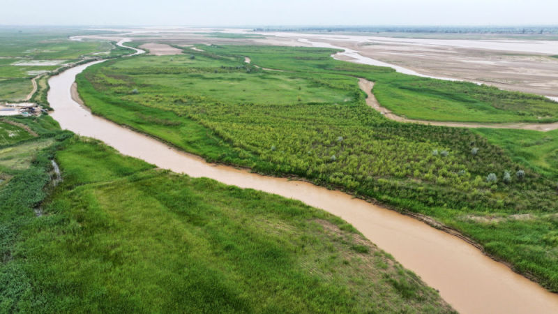 这是2025年6月22日在宁夏平罗县境内拍摄的黄河滩涂湿地(无人机照片)。新华社记者 王鹏 摄