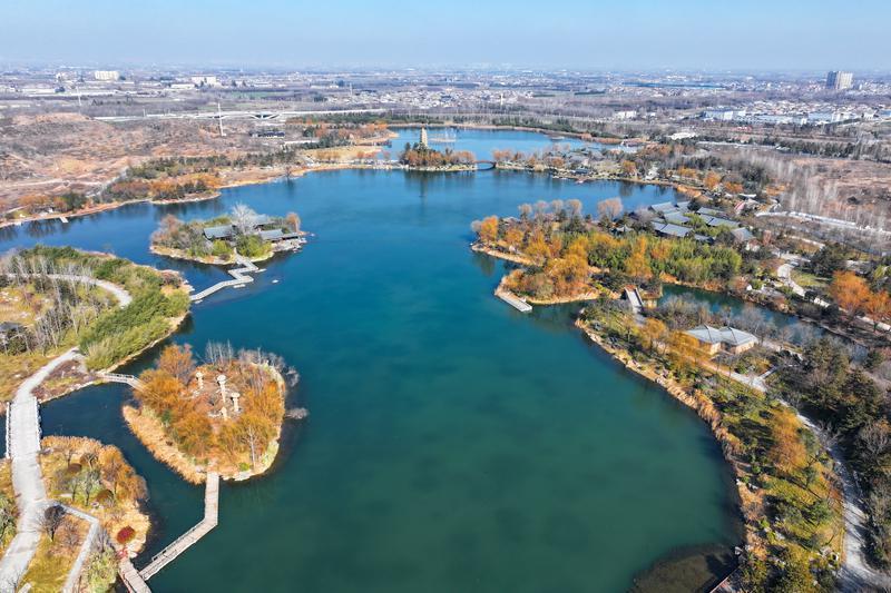 1月13日,冬日的鄠邑区渼陂湖美景如画。湖水清澈,波光粼粼,湖畔亭台楼阁错落有致,远处秦岭山脉若隐若现,绘就出一幅绝美的冬日诗意画卷。
