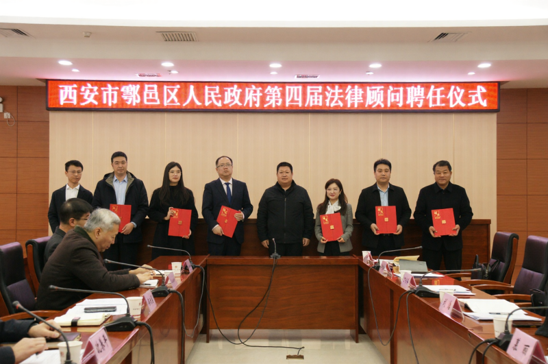 刘惠利局长通报鄠邑区政府第四届法律顾问选聘情况并宣读新聘法律顾问(法律服务团队)名单。吴区长与受聘律师和法律服务团队颁发聘书。两位受聘的法律顾问作表态发言,表示将珍惜荣誉、勤勉尽责,为区政府提供优质高效的法律服务。