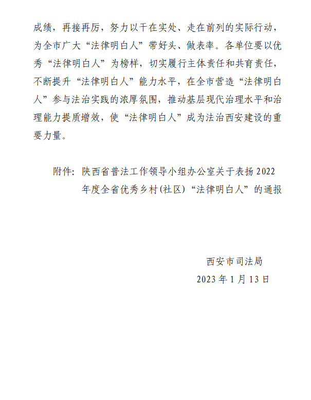 为激励先进、振奋精神、激发干劲,进一步推动“法律明白人”培育工作走深走实。近日,中共陕西省委普法工作领导小组办公室对陕西省优秀“法律明白人”予以了通报表扬。