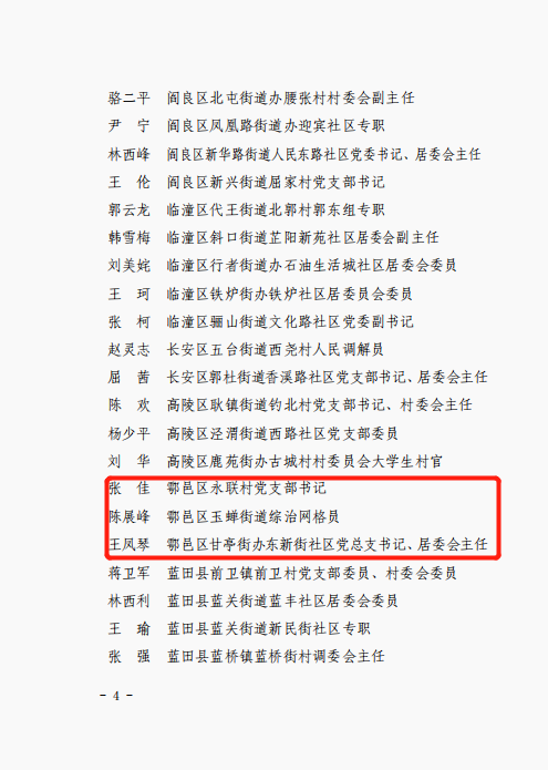 鄠邑区永联村党支部书记张佳、鄠邑区玉蝉街道综治网格员陈展峰、鄠邑区甘亭街办东新街社区党总支书记、居委会主任王凤琴榜上有名。