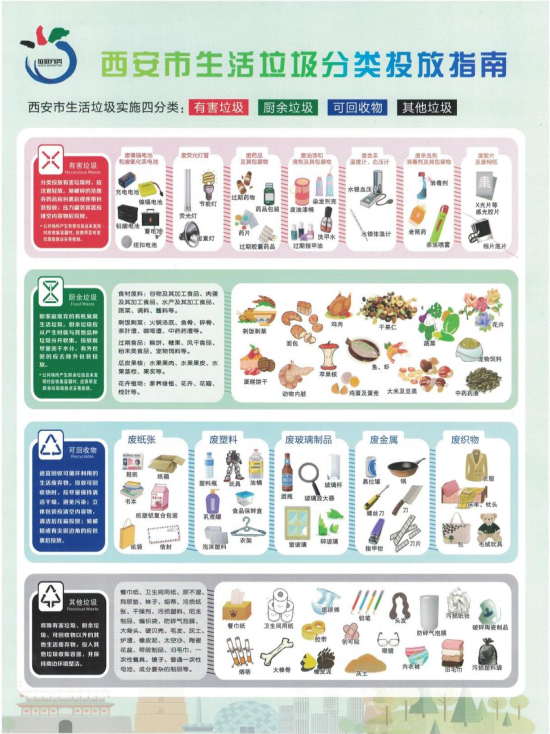《西安市生活垃圾分类投放指南》以图文形式直观的告诉市民,生活垃圾一般按照有害垃圾、厨余垃圾、可回收物、其他垃圾进行“四分类”。其对应的垃圾桶颜色分别是红、绿、蓝、黑。