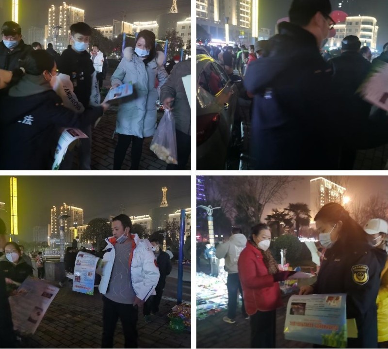 联合执法人员向人民路广场、古槐广场等人群密集区域发放宣传烟花爆竹禁售禁燃危害、通告及奖励办法,倡导群众争当烟花爆竹禁售禁放宣传员。