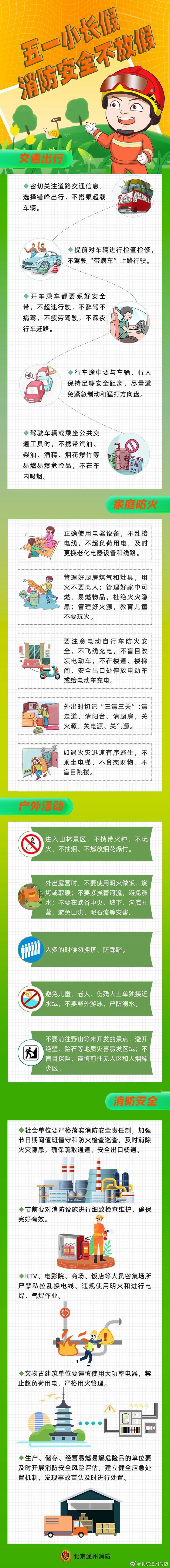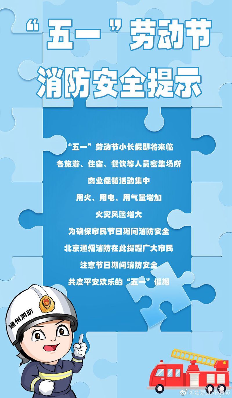“五一”劳动节小长假即将来临,各旅游、住宿、餐饮等人员密集场所,用火、用电、用气量增加,火灾风险增大。北京通州消防提醒大家,注意节日期间消防安全,共度平安欢乐的“五一”假期。