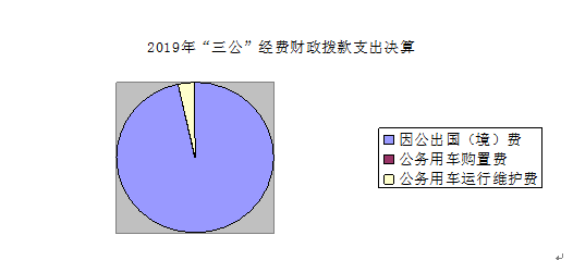 2019年“三公”经费财政拨款支出决算中,因公出国(境)费支出决算5.72万元,占97%;公务用车购置费支出0万元,占0%;公务用车运行维护费支出决算0.19万元,占3%;公务接待费支出决算5.72万元,占97%。具体情况如下: