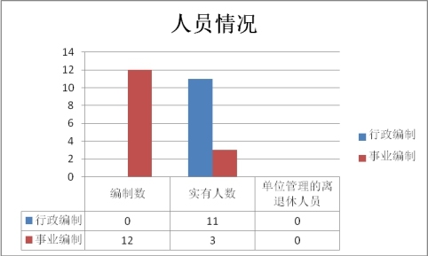 截至2019年底,本部门人员编制12人,其中行政编制0人、事业编制12人;实有人员14人,其中行政11人(已调走两人工资关系未办理)、事业3人。单位管理的离退休人员0人。