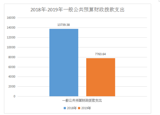 2019 年一般公共预算财政拨款支出7763.74万元,占本年支出合计的89.5%。与上年相比,一般公共预算财政拨款支出减少5975.64万元,减少43.5%,主要原因是机构改革将优抚安置、医疗救助、救灾等业务划转,相应的支出减少。