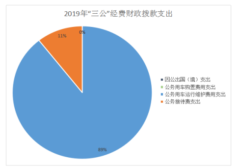 2019年“三公”经费财政拨款支出决算中,因公出国(境)费支出决算0万元,占0%;公务用车购置费支出0万元,占0%;公务用车运行维护费支出决算0.84万元,占89.4%;公务接待费支出决算0.1万元,占10.6%。具体情况如下: