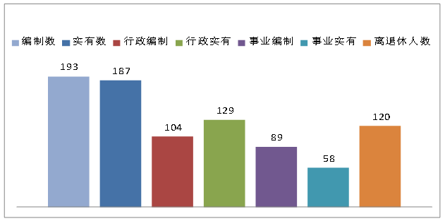 截至2019年底,本部门人员编制193人,其中行政编制104人、事业编制89人;实有人员187人,其中行政129人、事业58人。单位管理的离退休人员120人。