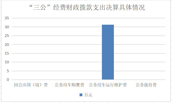 2019年“三公”经费财政拨款支出决算中,因公出国(境)费支出决算0万元,占0%;公务用车购置费支出0万元,占0%;公务用车运行维护费支出决算31.28万元,占100%;公务接待费支出决算0万元,占0%。具体情况如下: