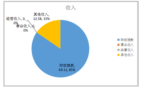 2019年收入合计81.69万元,其中:财政拨款收入69.11万元,占84.6%;事业收入0万元,占0%;经营收入0万元,占0%;其他收入12.58万元,占15.4%。