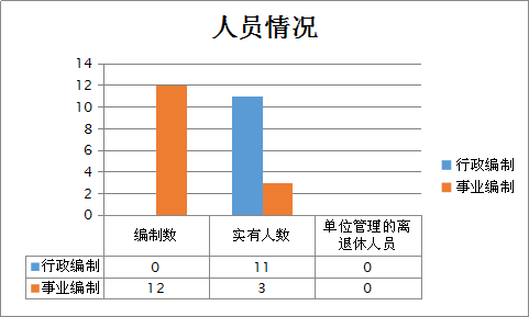 截止2019年底,本部门人员编制12人,其中行政编制0人、事业编制12人;实有人员14人,其中行政11人(已调走两人工资关系未办理)、事业3人。单位管理的离退休人员0人。