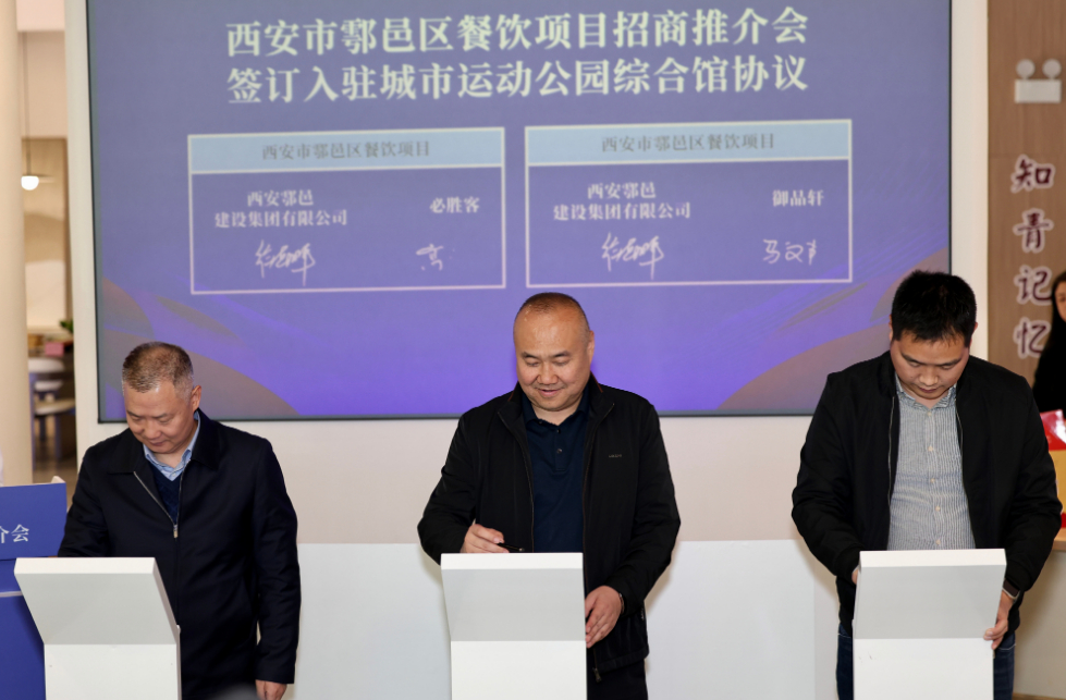 西安鄠邑建设集团有限公司董事长徐朝晖同西安饮食股份有限公司党委副书记、总经理冯凯签订战略合作协议,鄠建集团同必胜客品牌代表高永业、御品轩市场拓展经理马文韬签订入驻协议,签约双方将共同携手,精诚合作,推动鄠邑餐饮行业高质量发展。