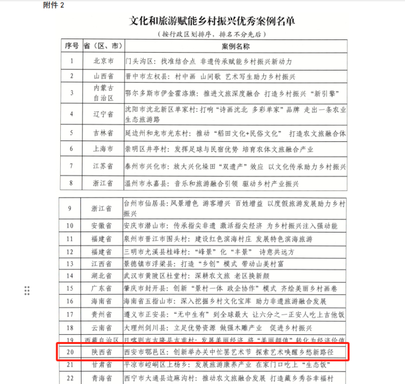 4月1日,为全面贯彻党的二十大精神,深入推进实施乡村振兴战略,根据《文化和旅游部办公厅关于征集文化和旅游赋能乡村振兴典型案例的通知》(办政法发〔2023〕148号)有关要求,文化和旅游部组织开展了文化和旅游赋能乡村振兴典型案例的征集和遴选工作,确定了文化和旅游赋能乡村振兴十佳案例和优秀案例名单,现予公布。我区“创新举办关中忙罢艺术节 探索艺术唤醒乡愁新路径”入选优秀案例名单。