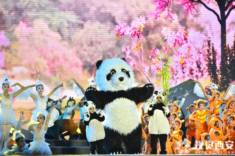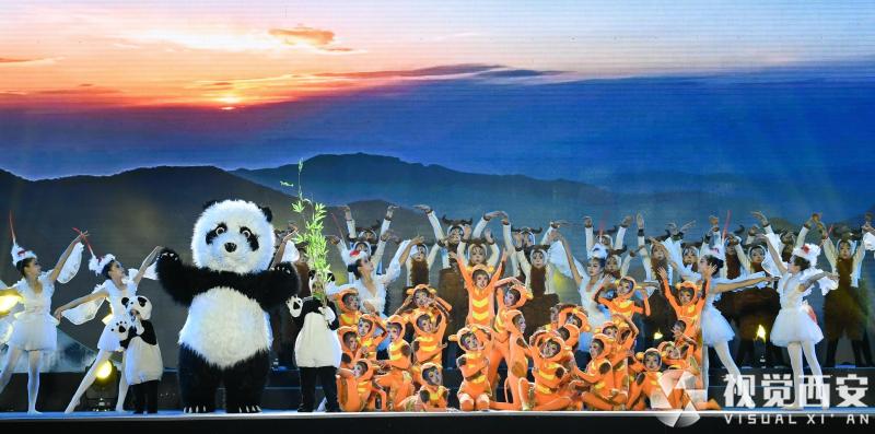 身穿蓝色衣裙的舞蹈演员仿佛涓涓细流,朱鹮翩翩起舞,金丝猴山间嬉戏……小演员们仿佛精灵一般,化身秦岭四宝,时而轻盈,时而调皮,时而帅气,时而憨态可掬,赢得现场一片热烈掌声和欢呼。民间非遗传承人带来的四宝木偶戏更是栩栩如生,在如梦如幻的舞台上展示秦岭生物多样性的灵动多彩之姿。