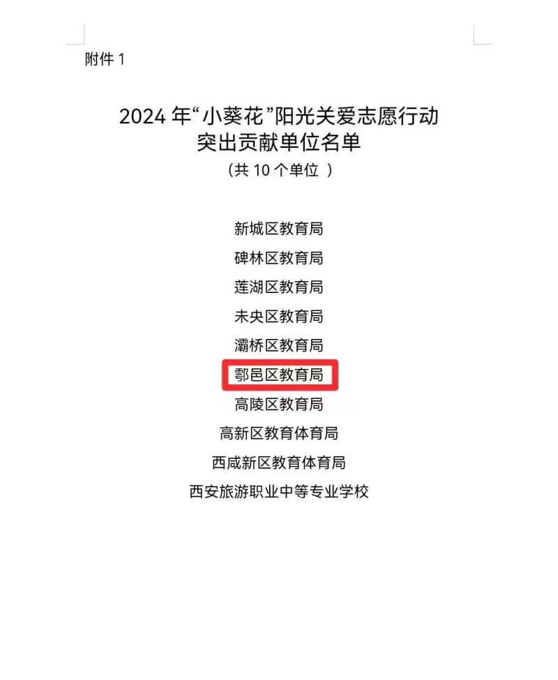 近日,西安市教育局对“西安市2024年度“小葵花”阳光关爱志愿行动开展情况进行了总结,对先进单位和先进个人进行了表扬通报。
