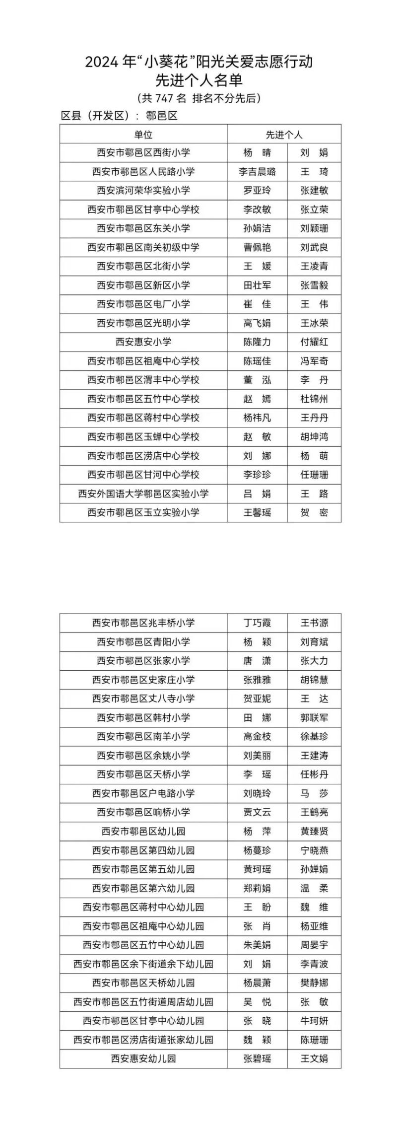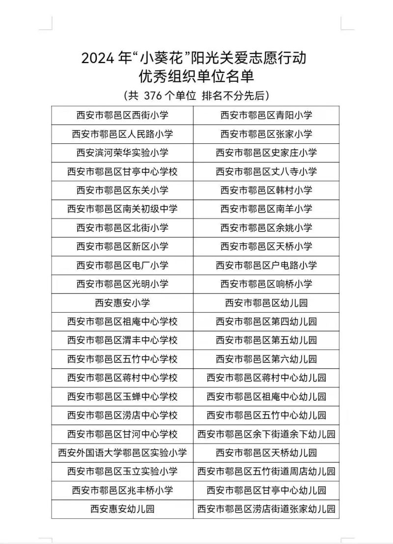 通报中鄠邑区教育局被授予2024年“小葵花”阳光关爱志愿行动突出贡献单位荣誉称号;鄠邑区西街小学等44所学校(园)被授予2024年“小葵花”阳光关爱志愿行动优秀组织单位荣誉称号;杨晴等88人被授予2024年“小葵花”阳光关爱志愿行动先进个人荣誉称号。