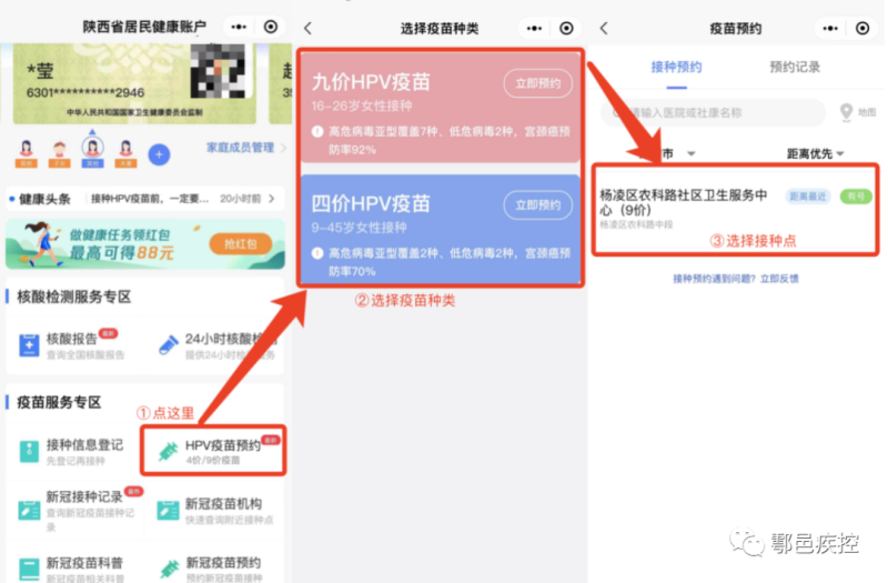 (4)鄠邑区四价、九价HPV疫苗通过“【健康陕西公众服务】小程序”进行预约,请市民朋友切勿听信其他渠道四价、九价HPV疫苗信息,以防上当受骗。
