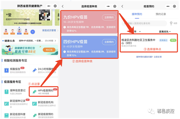 (4)鄠邑区四价、九价HPV疫苗通过“【健康陕西公众服务】小程序”进行预约,请市民朋友切勿听信其他渠道四价、九价HPV疫苗信息,以防上当受骗。
