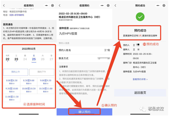 (5)本次接种的四价、九价HPV疫苗,数量有限,预约成功者请按时接种;没有预约到的居民请及时关注“鄠邑疾控”及“健康陕西公众服务”微信公众号,每次预约公告将第一时间发布。