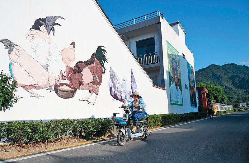 村民骑车经过西安市鄠邑区蔡家坡村的主题壁画(2022年7月5日摄)李一博摄/本刊