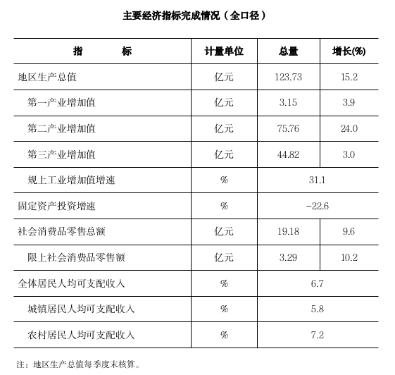1-3月,全区生产总值123.73亿元,按可比价格计算,同比增长15.2%。