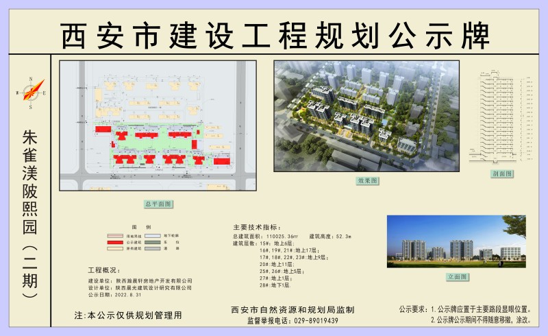 陕西瀚晨轩房地产开发有限公司建设的朱雀渼陂熙园(二期)项目位于西安市鄠邑区渼陂路以北,朱雀渼陂熙园(一期)以南,娄敬路以西,北极路以东。西安市自然资源和规划局鄠邑分局依据有关法律、法规和规范对项目设计方案进行了审核,拟原则同意本方案,现对该项目设计方案有关情况进行公示,具体内容为: