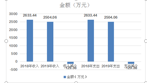 2019年支出总计2504.06万元,2018年度支出总计2633.44万元,较上年减少129.38万元,减少5%;