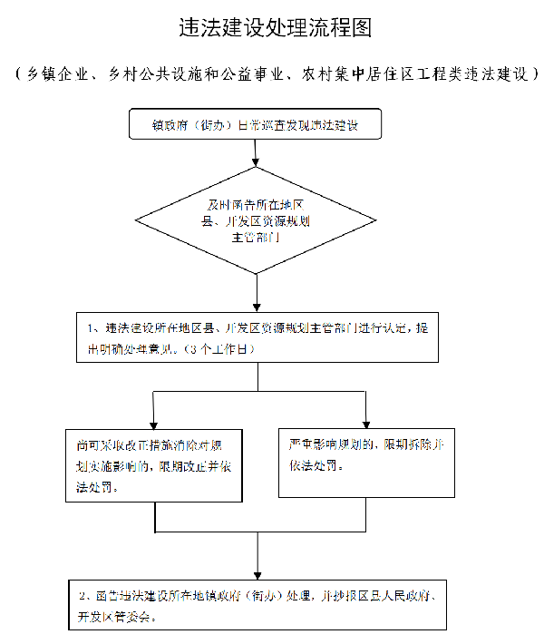 镇人民政府(街道办事处)在日常巡查中发现违法建设,应及时函告项目所在地相关行政主管部门,相关行政主管部门在3个工作日内按职责对违法建设进行认定并提出明确处理意见,及时函告违法建设所在地镇人民政府(街道办事处)处理,并抄报区县人民政府、开发区管委会。