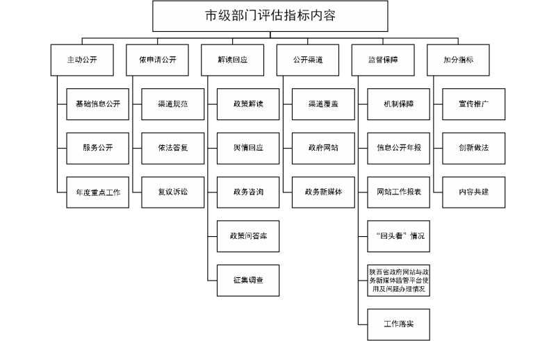 5.“监督保障”指标。下设“机制保障”“信息公开年报”“网站工作报表”“回头看情况”“陕西省政府网站与政务新媒体监管平台使用及问题办理情况”“工作落实”6个二级指标。主要引导各单位加强组织保障,配齐配强工作力量,保障工作经费,理顺工作机制,强化协同联动,开展考核培训,全面提升我市政务公开整体水平。深入推进基层政务公开标准化规范化工作,打通政务公开“最后一公里”,让群众对政务公开看得到、听得懂、易获取、能监督、好参与。
