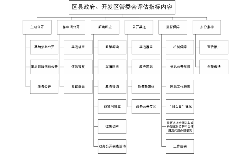 6.加分指标。区县政府和开发区管委会,下设“宣传推广”“创新做法”2个二级指标。市级部门,下设“宣传推广”“创新做法”“内容共建”3个二级指标。主要引导各单位坚持以人民为中心深化政务公开,积极开展政务公开工作创新试点,努力在体制机制、管理模式、服务方式等方面探索创新,及时总结推广好经验好做法,不断提升政务公开工作影响力和传播力。